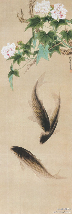 【賞析】整幅作品工整細致,主題突出,畫面簡潔,造型能力強,富于節(jié)奏感。柔韌有彈性的線條,清新的色調(diào),嚴謹?shù)脑煨停枥L了一幅芙蓉盛開,鯉魚嘻戲,生機盎然,充滿情趣的畫面。