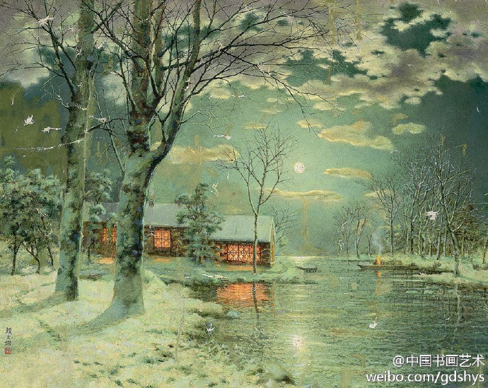 【賞析】作品描繪寒冬的晚上,明月高掛,湖泊平靜如鏡。畫中以清朗的天空為背景,房屋為中景,湖泊與旁邊的雪地為前景。整幅畫的構(gòu)圖來龍去脈清楚,疏密有序,景物互相呼應(yīng),寧靜地引導觀眾入畫,感受在寒冷的晚上,明月高掛照夜空的詩情畫意。