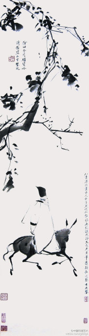 【賞析】此圖被公認為徐氏真跡。老翁和驢僅用寥寥數(shù)筆便形神俱備,對驢子的描繪,用解剖學的眼光看驢的造型并不準確,而它那踏著輕快步伐的神氣卻躍然紙上。背景樹枝、藤蔓則筆點零亂,使人頓有秋色蕭索之感。運用恰到好處的省略手法,徐渭營造了一個空而不虛、意境深遠的藝術(shù)空間。