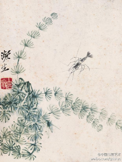 【賞析】中國美術(shù)館藏。齊白石的蝦,巧妙地利用墨色和筆痕表現(xiàn)蝦的結(jié)構(gòu)和質(zhì)感,又以富有金石味的筆法描繪蝦須和長臂鉗,使純墨色的結(jié)構(gòu)里也有著豐富的意味,把“形”“質(zhì)”“動”三個要素完滿的表現(xiàn)出來。