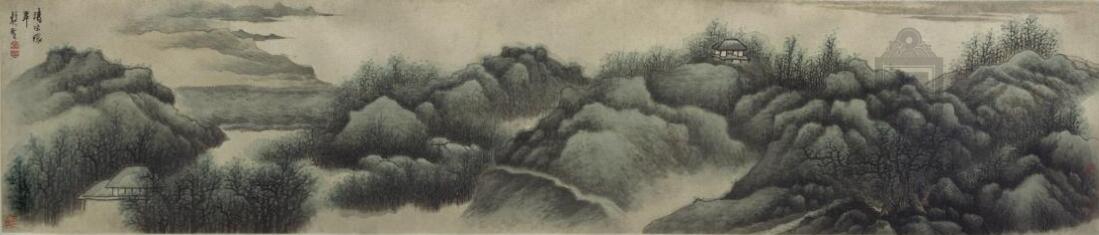 此圖即描繪龔賢所居的清涼山實景。畫面大江開闊,古城環(huán)繞,山巒起伏綿延,清涼臺隱現(xiàn)于云霧之間。畫中未見人,想必都在屋中避暑吧。