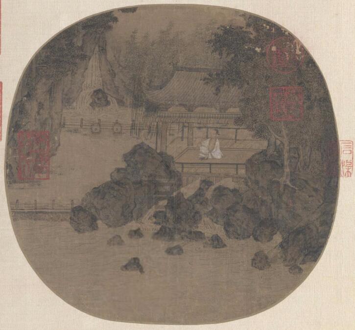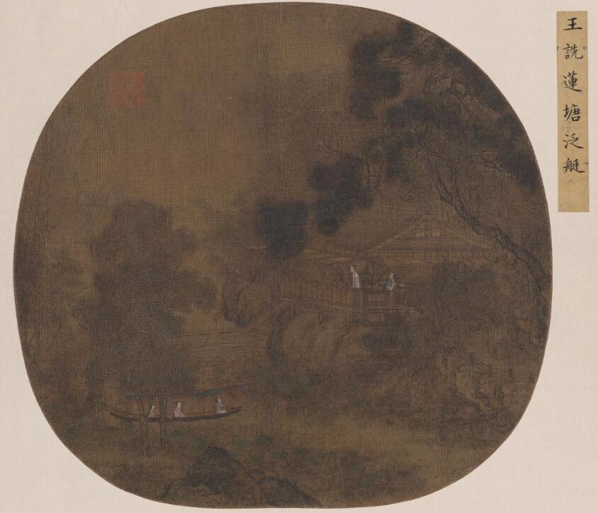 畫面長松密林,坡陀水閣。水閣內(nèi)二女子,一執(zhí)扇閑坐,一憑欄眺望,坡下蓮塘,一女泛舟而來。圖頁中的水閣以細筆勾勒,刻畫精微,設(shè)色淡雅,雖大不盈尺卻美侖美奐。此圖高度寫實的繪畫風格繼承了北宋畫院的傳統(tǒng),而蓮塘的迷濛與空靈增添了畫面亦真亦幻的抒情效果。