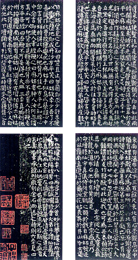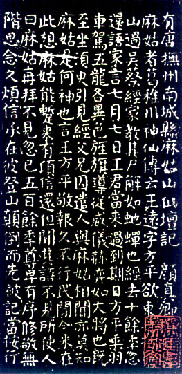 唐上元元年(760年)秋八月,顏真卿出貶蓬州(州治在今四川儀隴)長史, 上任 沿嘉陵江而上,至閬州新政縣(今四川儀隴)應(yīng)成都兵曹鮮于昱之請,為其石堂題記。 詳述鮮于氏家族的業(yè)績和開鑿石堂的始末,盛贊其父鮮于仲通。碑初見宋趙明誠《 金石錄》等,后晦。至清道光年間郭程先視學(xué)蜀中訪得,然僅存五石,字存58字。 道光以后又失一石,又缺12字。郭程先(又名郭尚先)跋云:“此碑魄力雄厚,吉光 片羽,少而愈珍。”