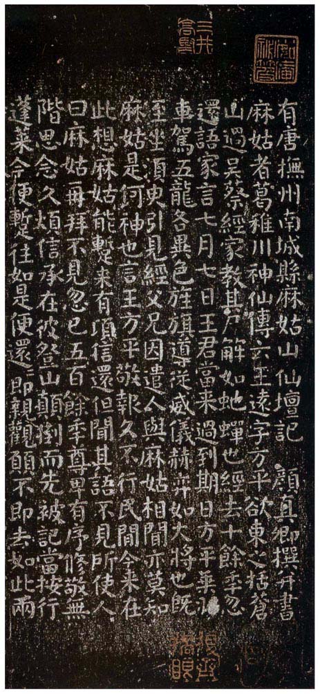 大歷十二年(777年) 六十九歲 二月,作《送辛子序》。三月, 宰相元載獲罪。四月十二日,朝廷召真卿回京。作《梁吳興太守柳惲西亭記》、《湖州石柱記》、《湖州射堂記》等。五月,撰書《項(xiàng)王碑陰述》,書《銀青光祿大夫康希銑神道碑銘》、《李玄靖碑》、《殷君夫人顏氏碑》、中書侍郎楊綰撰《李抱玉碑》。八月,經(jīng)楊綰和門下侍郎常袞推薦,任刑部尚書。十一月,獻(xiàn)《韻海鏡源》于朝廷。為前京兆尹杜濟(jì)撰書墓志銘及神道碑銘。