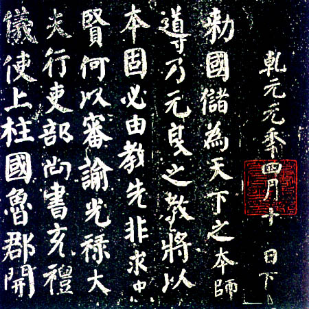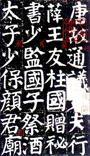 唐代宗永泰元年(765年) 五十七歲 正月,改元“永泰”。本月, 任吏部尚書,上《駁吏部尚書韋陟謚忠孝議》。八月,為座師孫逖文集作序。閏十月,撰并正書《顏元孫神道碑銘》(一說此碑銘書于大歷七年(772年)十一月遷葬伯父顏元孫夫婦于京兆萬年縣鳳棲原祖塋時(shí)。)。弟允臧任江陵少尹。