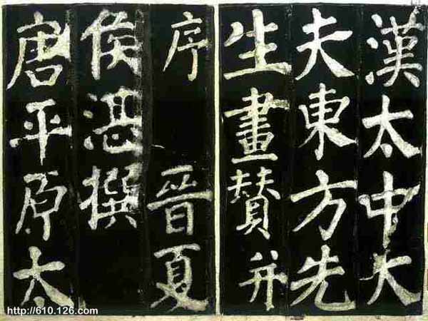 全稱《漢太中大夫東方先生畫贊碑》。自署天寶十三載(754年)十二月立。 晉 夏侯湛文,顏真卿楷書,碑陽額為其篆書。碑陰記為顏真卿撰文并楷書,額為其隸 書。340×151.6厘米。四面刻。碑陽、碑陰各15行,碑側(cè)各3行,行30字。 碑在山 東陵縣,拓本藏北京故宮博物院。