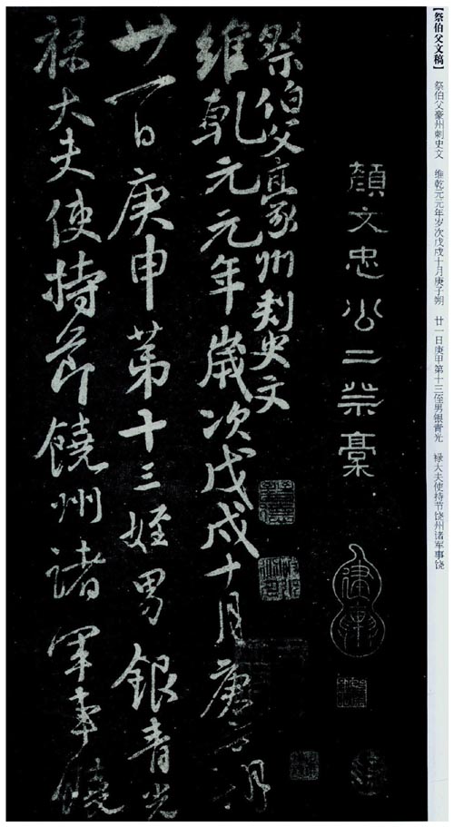 又稱《告伯父文稿》,全稱《祭伯父濠州刺史文》。自署書于乾元元年(758年) ,行草書,文稿一篇。凡36行,計(jì)410字。原刻早佚,見宋《甲秀堂帖》本。此稿與《祭侄稿》、《爭座位帖》世稱“三稿”。