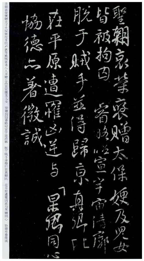 天寶十五載(756年) 四十八歲 正月,杲卿壯烈殉國。 朝廷拜真卿為戶部侍郎充本郡防御使,仍為平原太守。三月初,真卿聯(lián)絡(luò)清河、博平二郡,以三郡之兵在堂邑西南大破叛軍袁知泰部,收復(fù)魏郡,軍聲大振。真卿讓功于北海太守賀蘭進(jìn)明。平盧游奕使劉客奴謀以漁陽歸朝廷,真卿派員跨海遣送軍資,并以子頗為質(zhì)。三月二十九日,朝廷加真卿為河北招討采訪使。六月初九日,潼關(guān)失守。十三日,玄宗西奔。十七日,長安陷落。七月十二日,太子李亨在靈武即帝位,改元“至德” ,是為肅宗。真卿數(shù)遣使以蠟丸裹書陳事,詔授工部尚書兼御史大夫,仍以河北招討采訪使守平原,散官加銀青光祿大夫。有《皇帝即位賀上皇表》和《訪求清河行人李華牒》、《修書帖》等。十月,真卿遣和琳率義軍救河間,為叛軍所敗。二十二日,安祿山指使康沒野波進(jìn)攻平原,真卿率部棄城南下,渡黃河,從水路至荊、襄。與各道采訪使計(jì)會兵馬未成。本年,次兄允南遷司膳郎中,弟允臧遷監(jiān)察御史。