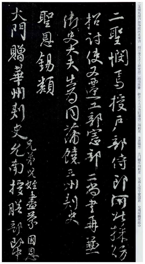 《顏真卿三表帖》作于至德二載(公元757年)四月。其中《讓憲部尚書表》為唐肅宗授顏真卿為憲部(即刑部)尚書時(shí),顏真卿自薄自謙、表示辭讓的奏章。時(shí)間早于《祭侄文稿》(758年)一年,為安史之亂爆發(fā)后17個月后。顏真卿在此表中對自己因固守平原而被擢升,表示謙讓,以為此乃人臣本分。而對棄郡卻抱著戴罪的心理,要求朝廷“重貶臣一官,以示天憲,使天下知有必行之法,則有必賞之令”。全文共 615字。因現(xiàn)存刻石多種,分居各地,未能得到書法史學(xué)界重視,原因之一就是版本大同小異,以拓傳拓,以訛傳訛,頗失顏書風(fēng)貌,未能顯現(xiàn)顏書風(fēng)韻。不論筆法與刻工與《爭座位稿》大相徑庭。《書法縱橫》網(wǎng)站2005年推出的《讓憲部尚書表》殘卷在很多方面出色地表現(xiàn)了顏真卿書法藝術(shù)特點(diǎn),加之精湛的刻石藝術(shù),高度忠實(shí)地再現(xiàn)了顏真卿墨跡本涵蓋的信息。應(yīng)列為顏真卿行書不可多得的代表作品。雖為殘卷,不失為一件難得的對顏真卿書法藝術(shù)研究文獻(xiàn)的重要補(bǔ)充。