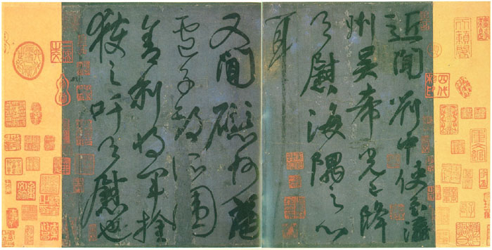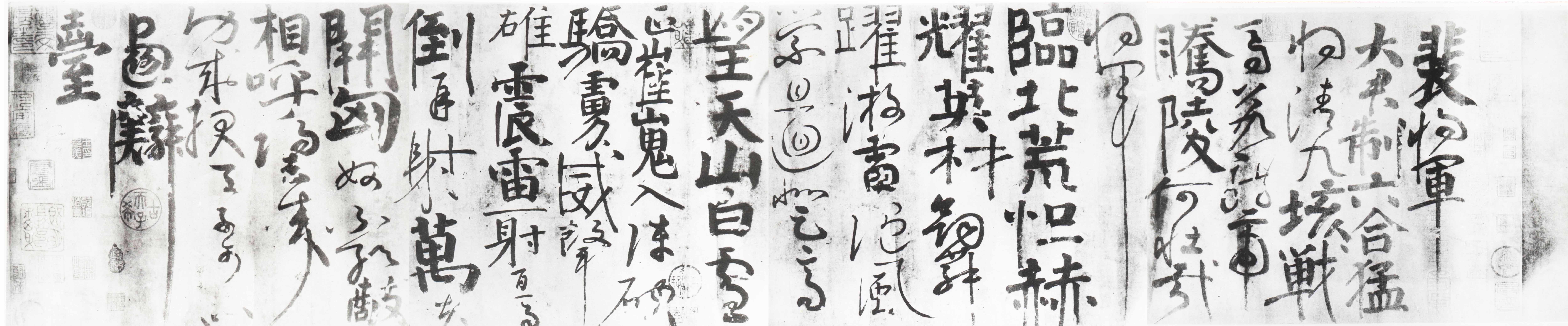 此帖又稱《送裴將軍北伐詩卷》,首見南宋留元剛《忠義堂帖》刻本。據(jù)黃本 驥《顏魯公文集·贈裴將軍案》(四庫備要本)稱:“裴將軍,裴?也。《新唐書· 李白傳》:‘文宗時(shí)詔李白歌詩,裴?舞劍,張旭草書,為三絕。’?嘗與幽州都 督孫 北伐,為奚所圍,?舞刀立馬,上矢四集,皆迎刃而斷,奚驚,引去。其事 在睿宗時(shí),見《新唐書·突厥傳》。”