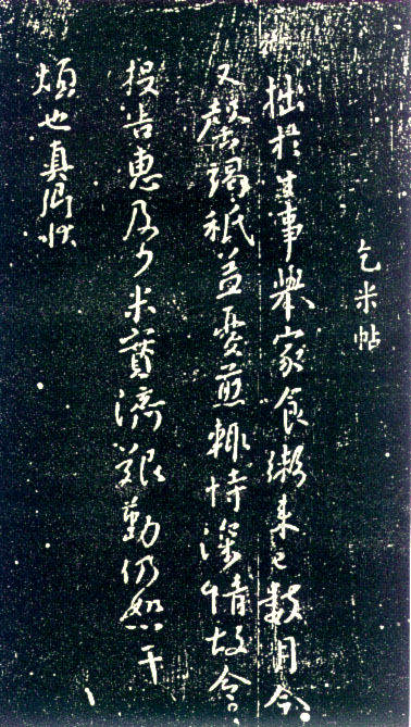 據(jù)宋歐陽修《集古錄》云:“此本墨跡在余亡友王子野家。子野生于相家而清苦甚寒士,嘗模帖刻石遺于朋友。”米芾《寶章待訪錄》云:《乞米帖》“真帖楮紙?jiān)诔埨商K 處,度支郎中舜元子也。得于關(guān)中安氏,士人多有臨拓本。此卷古玉軸,縫有‘舜元’字印,范仲淹而下題跋。”后真跡迷失。可見北宋時(shí),已有臨拓本傳世。《忠義堂帖》不見“舜元”字印及諸人題跋,當(dāng)是以模本入石者。