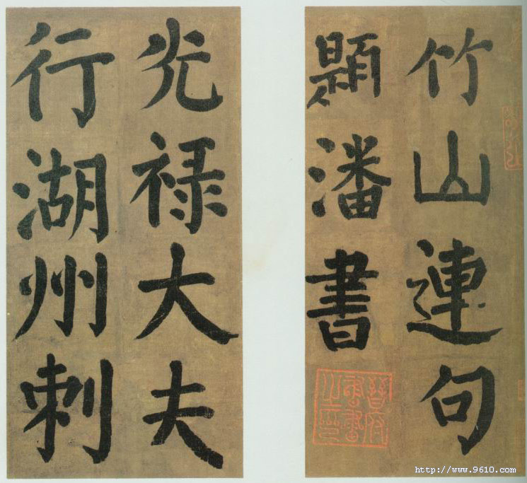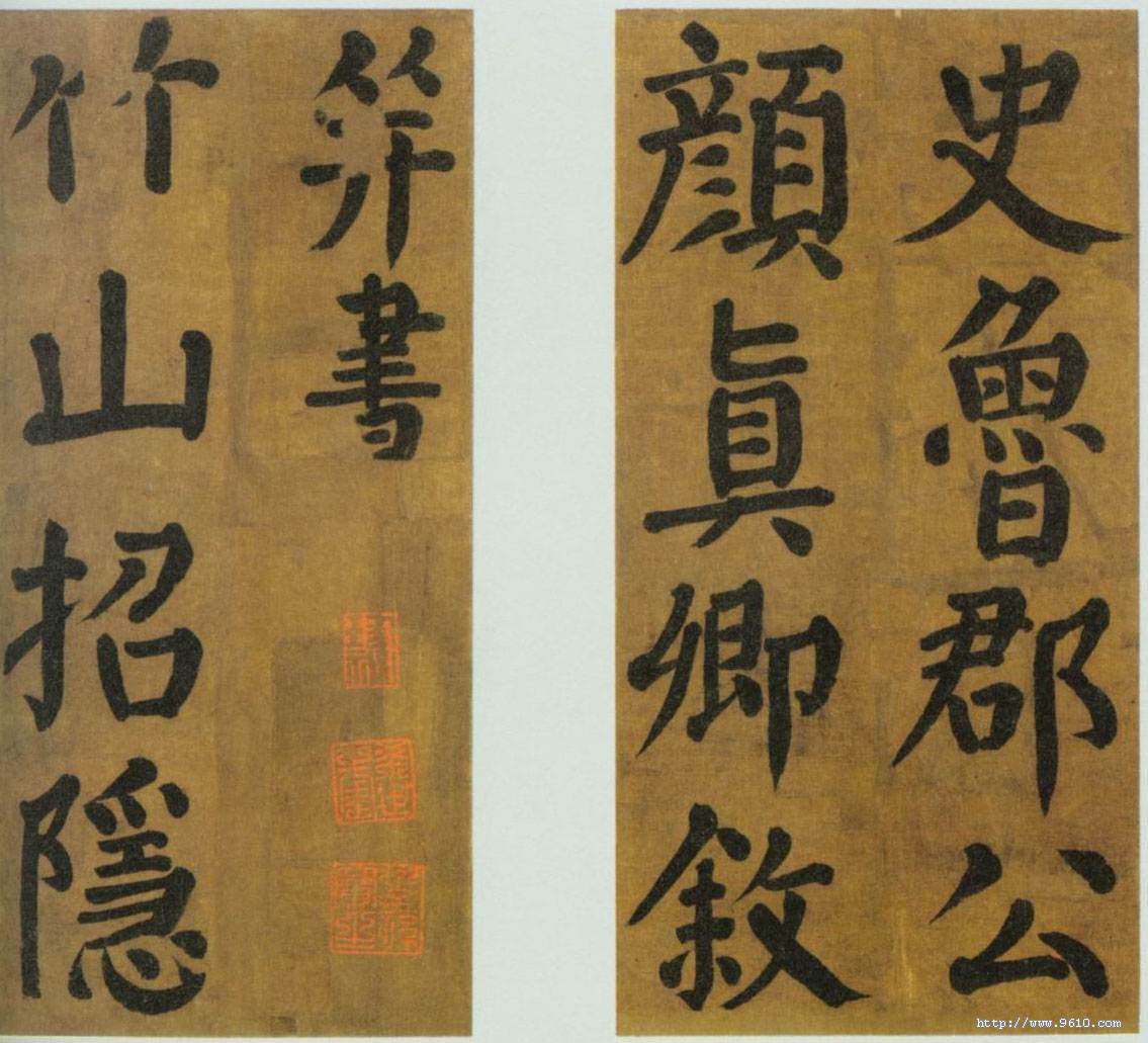 又稱 《竹山潘氏堂聯(lián)句》。此帖著錄首見《宣和書譜》。為顏氏與諸友人于竹山堂作詩聯(lián)句。書法端嚴(yán)渾厚,雖乏顏書磅礴之勢,但楷則猶存。有“紹興”、“緝熙敬止”、“希世之書”、 “御府之印”、“容齋清玩”、“晉府圖書”、“ 玉張氏”、“王世懋印”、“ 蒼嚴(yán)”、“安儀周家珍藏”、“鐵保私印”、“葉公綽”等鑒藏印。帖前有標(biāo)簽“ 顏魯公竹山連句詩帖”。帖后有宋米友仁、清姚鼐、鐵保三家題跋。曾經(jīng)南宋高宗 紹興內(nèi)府、明晉王府、清梁清標(biāo)、安歧等收藏。明王世貞《 州續(xù)稿》、清安歧《 墨緣匯觀》等著錄。