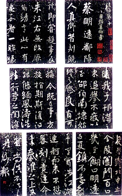 是帖流傳有緒。據(jù)《清河書畫舫》:“顏真卿大字《瀛州帖》,為宋宣和御府 故物,元初藏張可與家。”又據(jù)帖后王芝題跋:至正二十三年(1363年),王芝曾從張嘯江處以陸柬之《蘭亭詩》、歐陽詢《卜商帖》易得。明嘉靖間歸項(xiàng)元汴“天籟 閣”,后輾轉(zhuǎn)落入廠肆。民初歸李石曾。帖內(nèi)鈐有“三槐”、“悅生”二半印,“ 紹興”、“張晏私印”、“王芝”、“項(xiàng)元汴印”等鑒藏印。后有元王英孫、鮮于 樞、張彥清、白湛淵、田師孟及明文衡山、董思白等題識。明《戲鴻堂》帖亦有刻入。