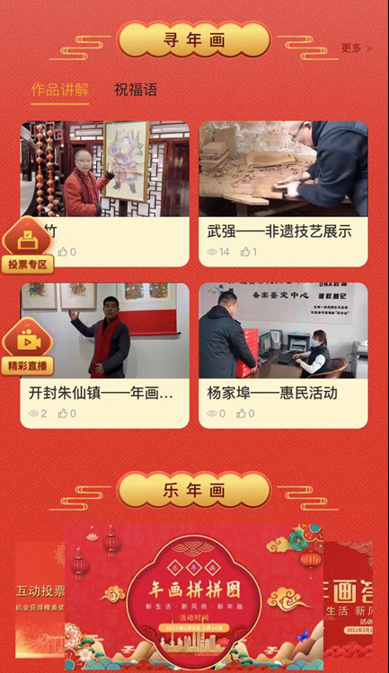賞年畫,在線展示各地推薦的優(yōu)秀作品,對(duì)參加線下展覽的作品做多維度重點(diǎn)推介;講年畫,由民間藝術(shù)評(píng)論家、作品創(chuàng)作者講述創(chuàng)作故事,以采訪視頻、圖文等形式,豐富畫作的展示維度;繪年畫,推出年畫知識(shí)、藝術(shù)創(chuàng)意和繪畫技能視頻課程,在群眾中開展年畫藝術(shù)普及;尋年畫,以中國傳統(tǒng)年畫創(chuàng)作流派、中國民間文化藝術(shù)之鄉(xiāng)為分類導(dǎo)航,展示以年畫為載體的優(yōu)秀傳統(tǒng)文化保護(hù)與傳承;樂年畫,圍繞年畫傳統(tǒng)技藝、文學(xué)知識(shí)、傳統(tǒng)節(jié)慶等內(nèi)容,開展系列線上互動(dòng)答題活動(dòng)。