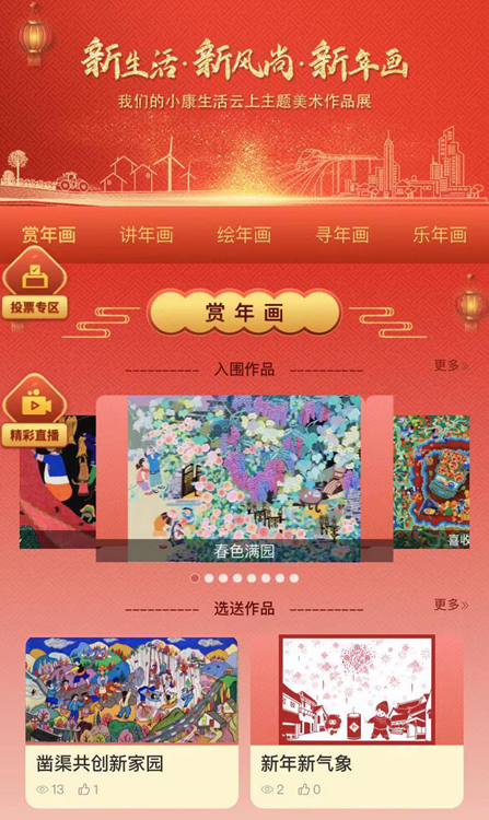 “新生活·新風(fēng)尚·新年畫”——我們的小康生活云上主題美術(shù)創(chuàng)作展(簡(jiǎn)稱“云上年畫展”),匯集了本次征集展示活動(dòng)全國各地推薦的千余幅作品,通過賞年畫、講年畫、繪年畫、尋年畫、樂年畫等多個(gè)欄目,線上線下相結(jié)合的互動(dòng)形式,進(jìn)行全方位展示。