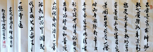 當(dāng)楊明學(xué)先生百米長卷《普陀圣境圖》完美收筆后,五雷禪寺當(dāng)家?guī)熋顨J心覺曾用書法的形式這樣描述,經(jīng)多年策劃,特受意弟子楊明學(xué)畫普陀山水墨畫實景圖百米長卷,歷時兩年余,終于辛丑年仲春完成此從古到今絕無僅有的撼世巨作,為佛教和普陀山的傳承增添了一筆濃彩,也為中國現(xiàn)代美術(shù)史上留下一點印跡。
