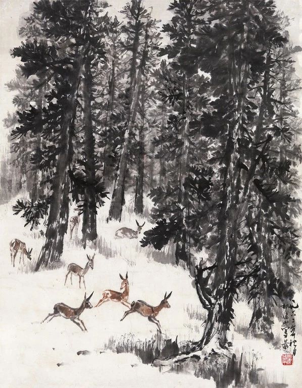 趙望云丨杉林麋鹿 69.5cm × 54.5cm 設(shè)色紙本 立軸