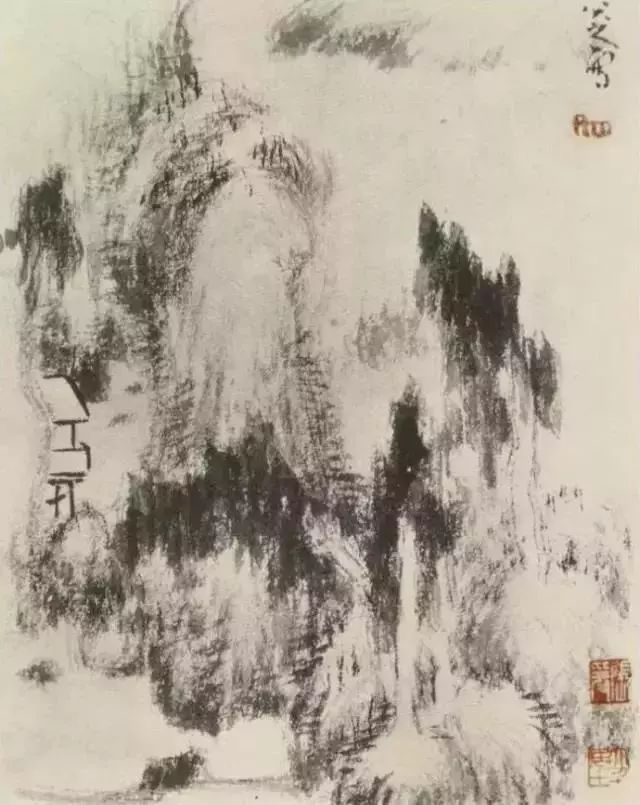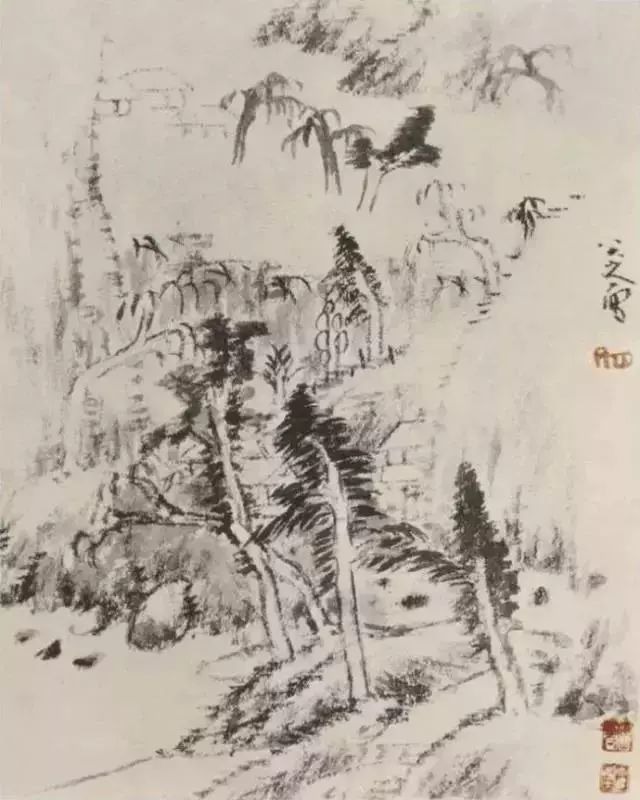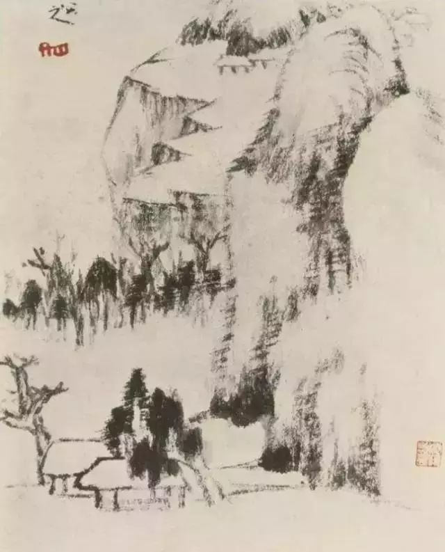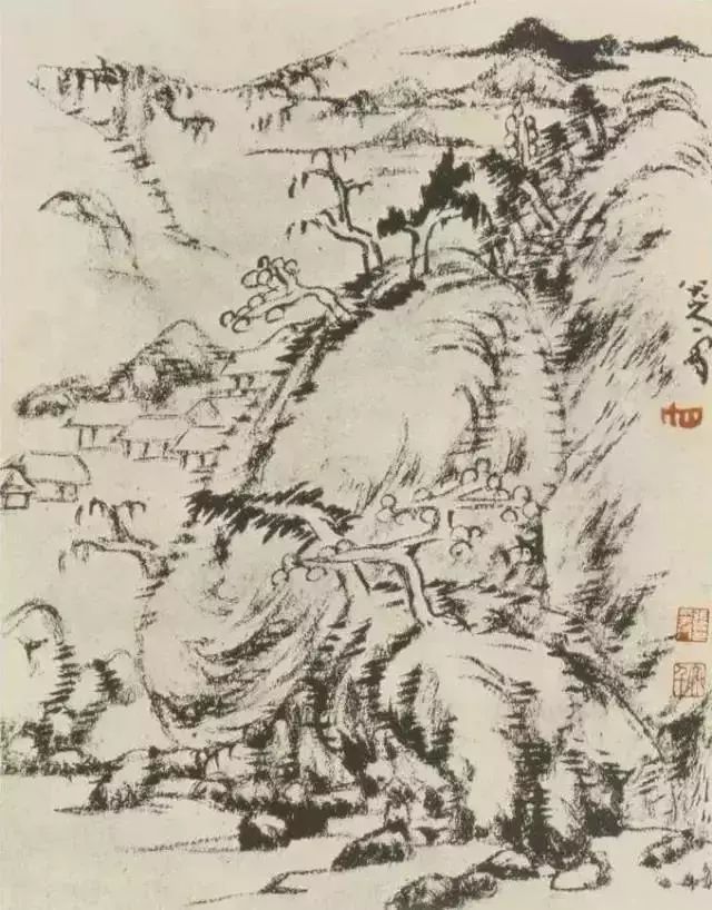 用篆筆禿毫簡扼地皴出山體、樹木和房舍,
