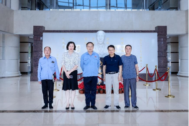 建華(右二)與永利公司黨委副書記岑建軍(中)、辦公室主任劉輝(左二)、宣傳部原部長(zhǎng)王曉亮(右一)、宣傳部部長(zhǎng)呂健(左一)、在廠史館前合影