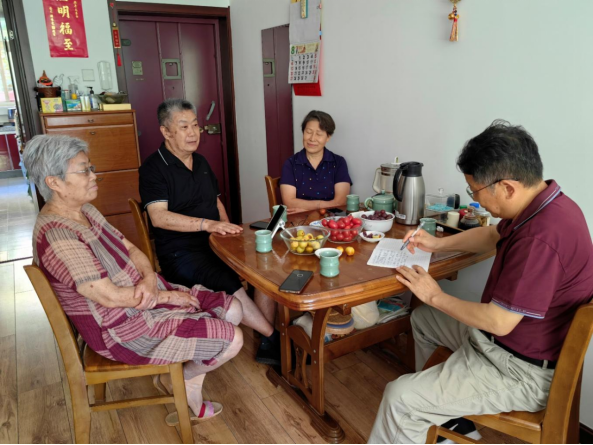 建華(右一)與侯德榜孫女侯盛欣(左一)、孫子侯盛錚(左二)和愛人孫開芳(右二)在家中采訪交流