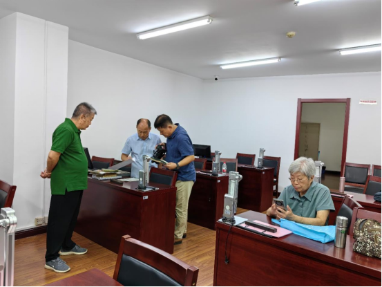侯盛欣(左一)、侯盛錚(右一)、呂健(左二)李雪松(右二)在天津市檔案館查閱拍攝侯德榜捐贈(zèng)珍品