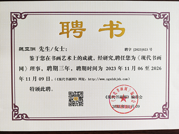魏亞州:男,畢業(yè)于山東藝術(shù)學(xué)院,本科文化,獲學(xué)士學(xué)位。中共黨員,籍貫甘肅省定西市,現(xiàn)居山東淄博。現(xiàn)為中國楹聯(lián)學(xué)會會員、中國楹聯(lián)學(xué)會書法藝術(shù)委員會委員、中華詩詞學(xué)會會員、中國傳統(tǒng)文化促進(jìn)會會員、山東省青年書法家協(xié)會會員、河北省文學(xué)藝術(shù)研究會會員、中國道教協(xié)會道家書畫院藝術(shù)委員、中國農(nóng)民書畫研究會會員、甘肅隴原魏徵書畫院副院長、中華五千文化藝術(shù)研究院副院長、蘭州市書法家協(xié)會會員、淄博市博山區(qū)書法家協(xié)會理事,現(xiàn)代書畫網(wǎng)理事。