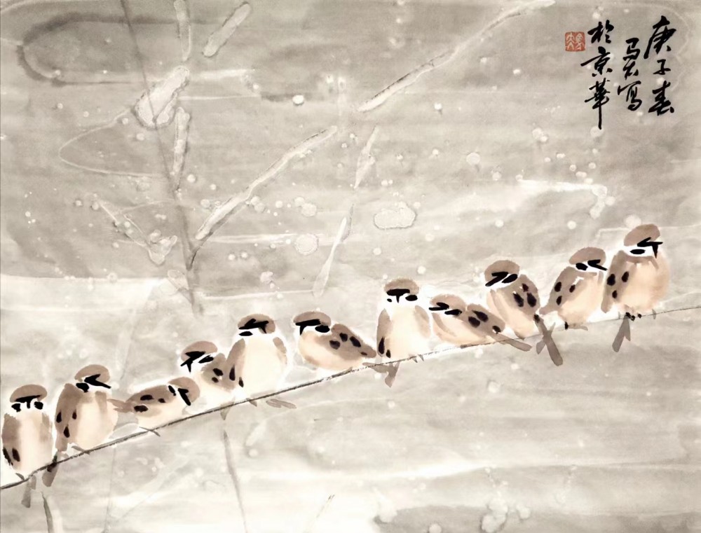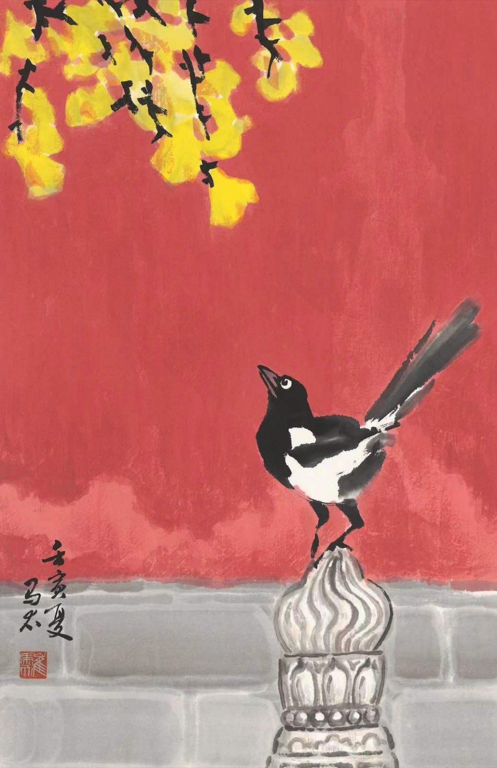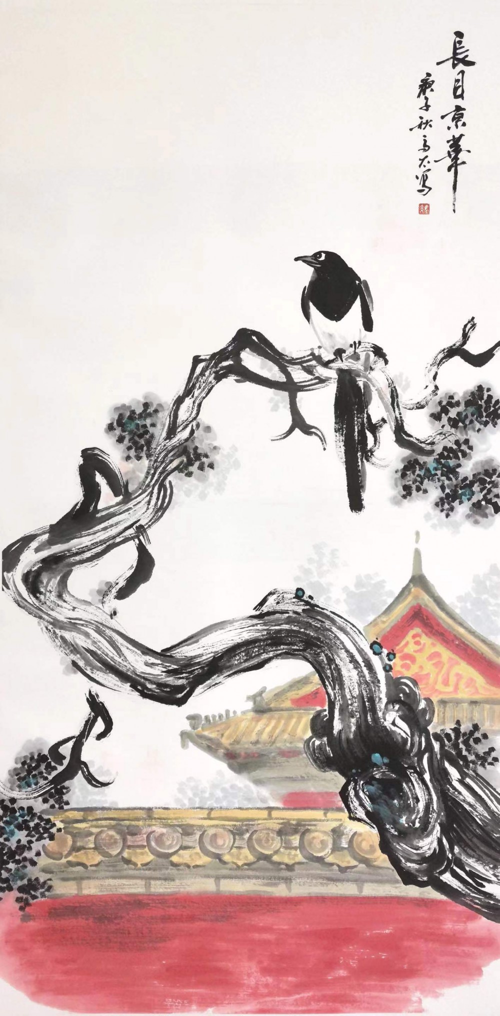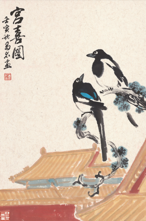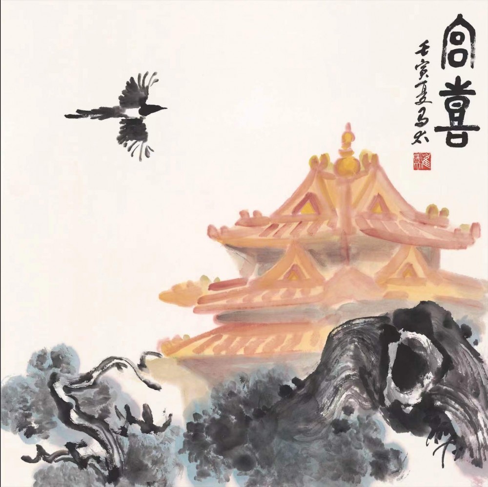 崔馬太老師是國畫《宮喜》的創(chuàng)始人。其父是故宮消防特勤站第一任指導(dǎo)員,崔馬太幼年隨軍居住在故宮文淵閣旁消防家屬宿舍,紅墻琉璃瓦充滿童年記憶。3歲拿起畫筆,40余年筆耕不輟,不斷探索傳統(tǒng)書畫新時(shí)代的表達(dá)。一次崔馬太故宮采風(fēng)時(shí)偶遇喜鵲駐足小憩。喜鵲展翅間悠然如兒時(shí)的自己,觸動(dòng)了記憶中的那一抹紅,剎那間喜由心生,國畫《宮喜》應(yīng)運(yùn)而成。