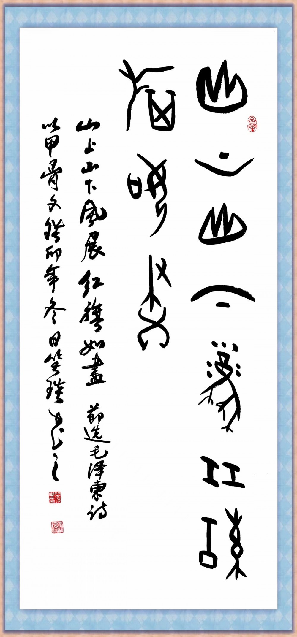 笑琰,本名靳新國,字雨潤,六十年代末生于河南安陽,書法家,詩人,資深編輯記者,國學(xué)學(xué)者、新聞攝影師,中學(xué)開始研習(xí)書法,初學(xué)顏、二王和米字,擅書甲骨文。17歲至20歲時(shí)曾參加著名書法家高向時(shí)、曹寶麟的書法班學(xué)習(xí)書法,多年來得到著名書法家江鳥(沈鴻根)老師指導(dǎo)。
