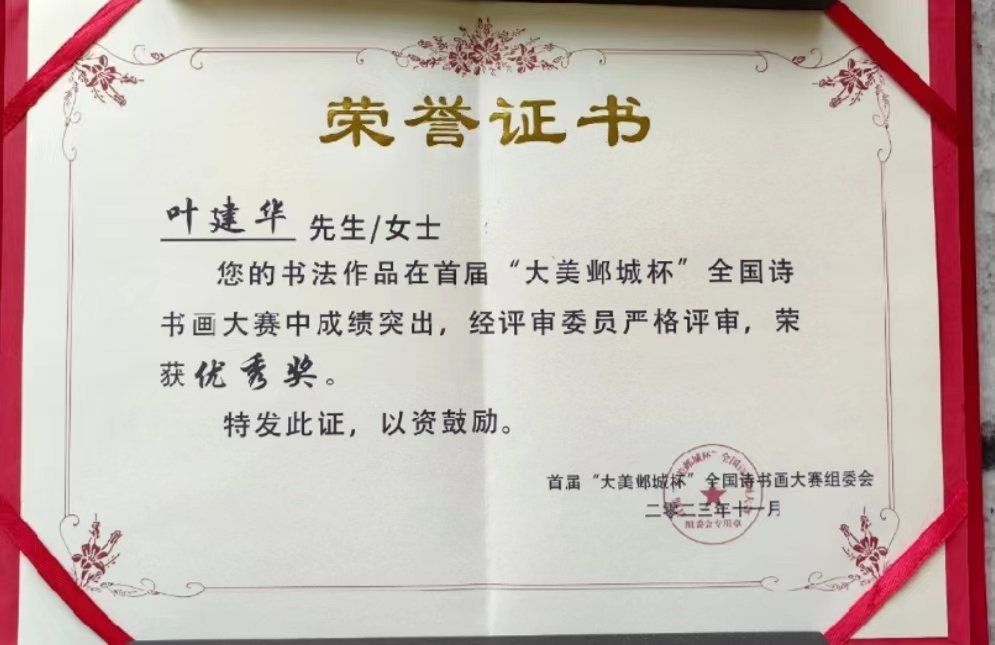 據(jù)了解,此次大賽領導重視、組織有方、效果良好,共收到來自全國各地詩詞、書法、美術作品2000余件,經(jīng)過專家組嚴格評審,共選出一等獎3名,二等獎6名,三等獎12名,優(yōu)秀獎100名,入圍500件。承蒙評委厚愛,我的詩書雙創(chuàng)作品獲得優(yōu)秀獎。2023年11月30日,因頒獎時間與我追星侯德榜采訪活動沖突,非常遺憾未能前往鄴城參加此次頒獎典禮及筆會活動。據(jù)參加此次頒獎典禮的朋友介紹,此次典禮內(nèi)容豐富、熱情周到、不虛此行。我雖身未至,和靳新國代表現(xiàn)代書畫網(wǎng)給武振江主任和組委會發(fā)去賀電表示熱烈祝賀!