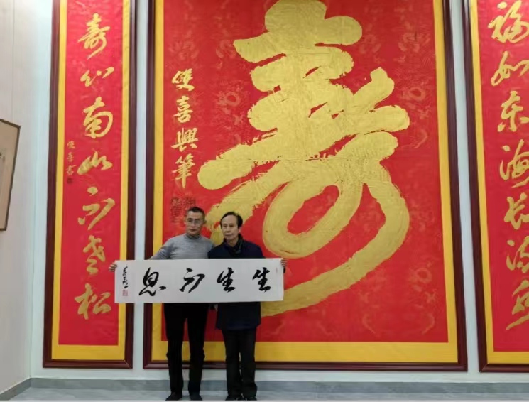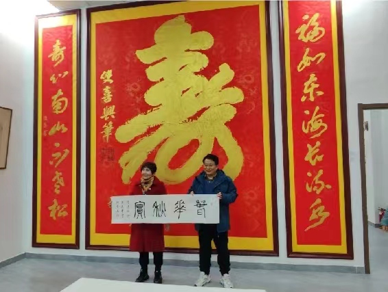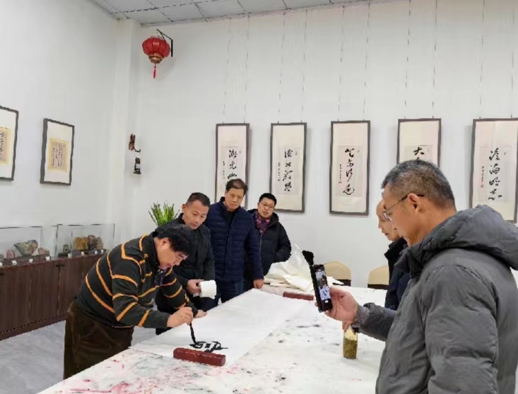 徐雙喜引領(lǐng)文友們參觀了榜書(shū)藝術(shù)中心,講述了他立志書(shū)法藝術(shù)勤學(xué)苦練、懸梁刺股的酸甜苦辣;開(kāi)拓創(chuàng)新、另辟蹊徑的獨(dú)創(chuàng)風(fēng)格;走出國(guó)門(mén)弘揚(yáng)國(guó)粹、為國(guó)爭(zhēng)光的民族自豪;鐫刻青山、墨香華夏、大地播芳的天道酬勤。
