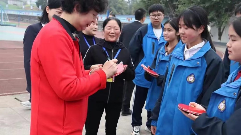 值得一提的是,作為乒乓球世界冠軍,童玲還前往自貢市大安區(qū)部分學(xué)校進(jìn)行考察,并指導(dǎo)孩子們進(jìn)行乒乓球訓(xùn)練。在學(xué)校負(fù)責(zé)人引領(lǐng)下,童玲參觀了舉重、古箏、象棋、丙烯畫(huà)、書(shū)法、心理健康等功能室。她對(duì)學(xué)校舉重、象棋特色成效,培養(yǎng)學(xué)生多種藝體素養(yǎng)表示贊賞,還親筆題寫(xiě)“龍馬精神”,激勵(lì)學(xué)校師生奮發(fā)圖強(qiáng)。