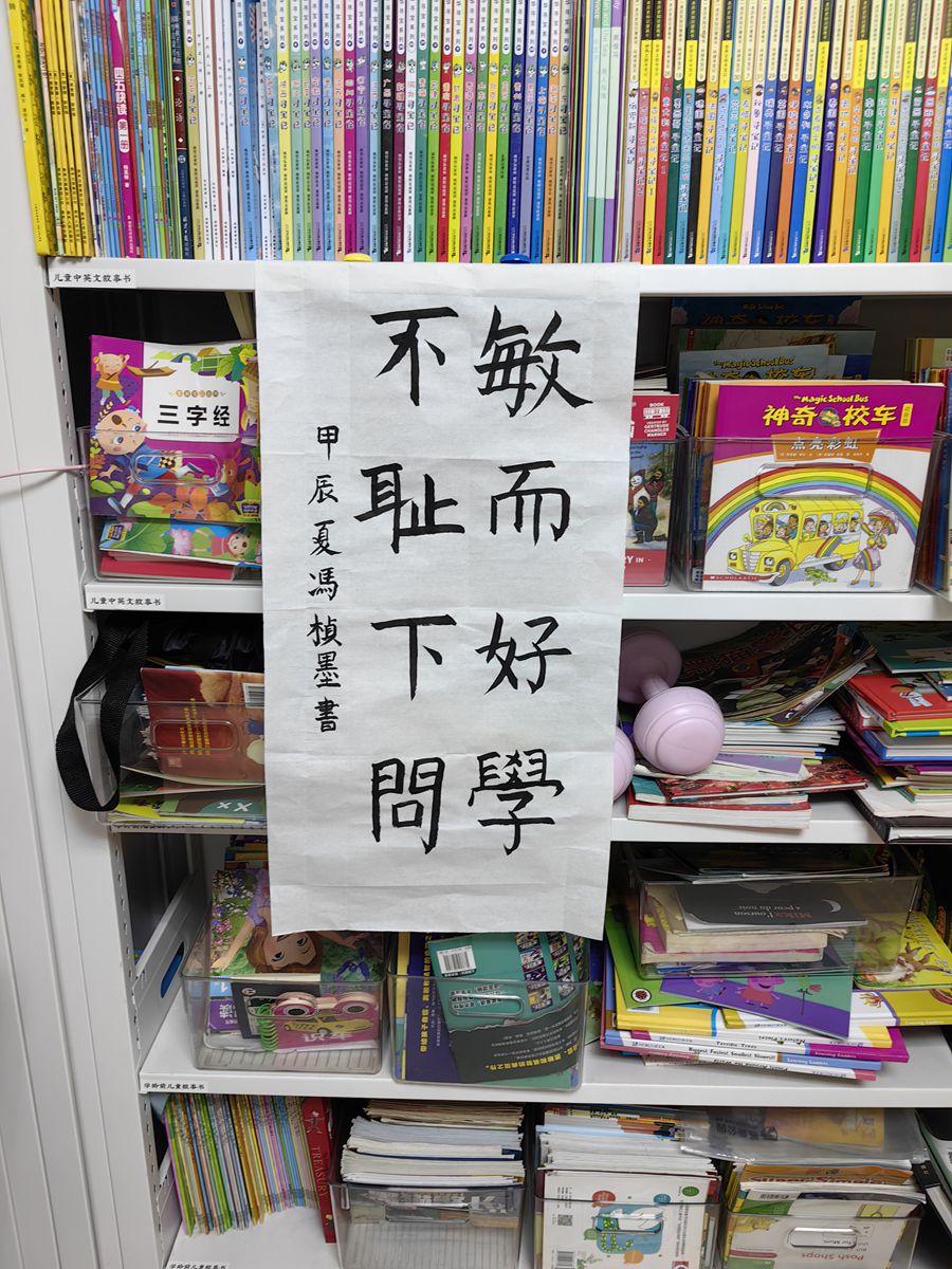 三個小朋友活潑可愛,姐弟情深。我們進得門來,馮夫人引導孩子們叫爺爺奶奶。指著楨墨姑娘書寫的“敏而好學,不恥下問”書法作品說,爺爺是書法家,你們向爺爺請教,幫助指導。我看了出自二年級小姑娘略帶顏楷韻味的書法作品后,連連點贊夸好。因書法結緣的孕育的孩子正在弘揚著國粹,賡續(xù)著文脈,讓我高興不已。
