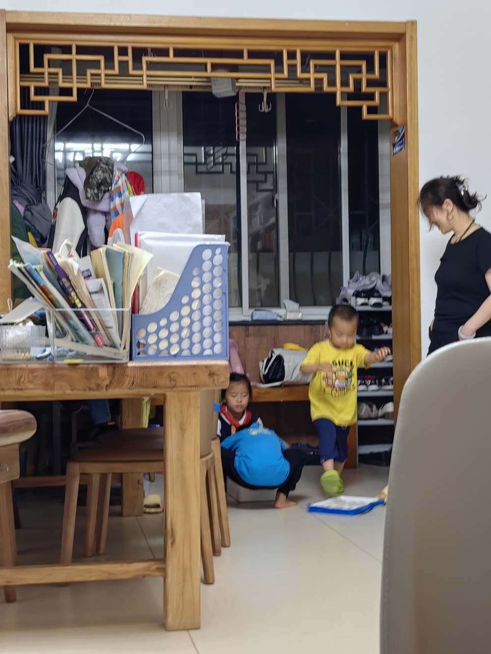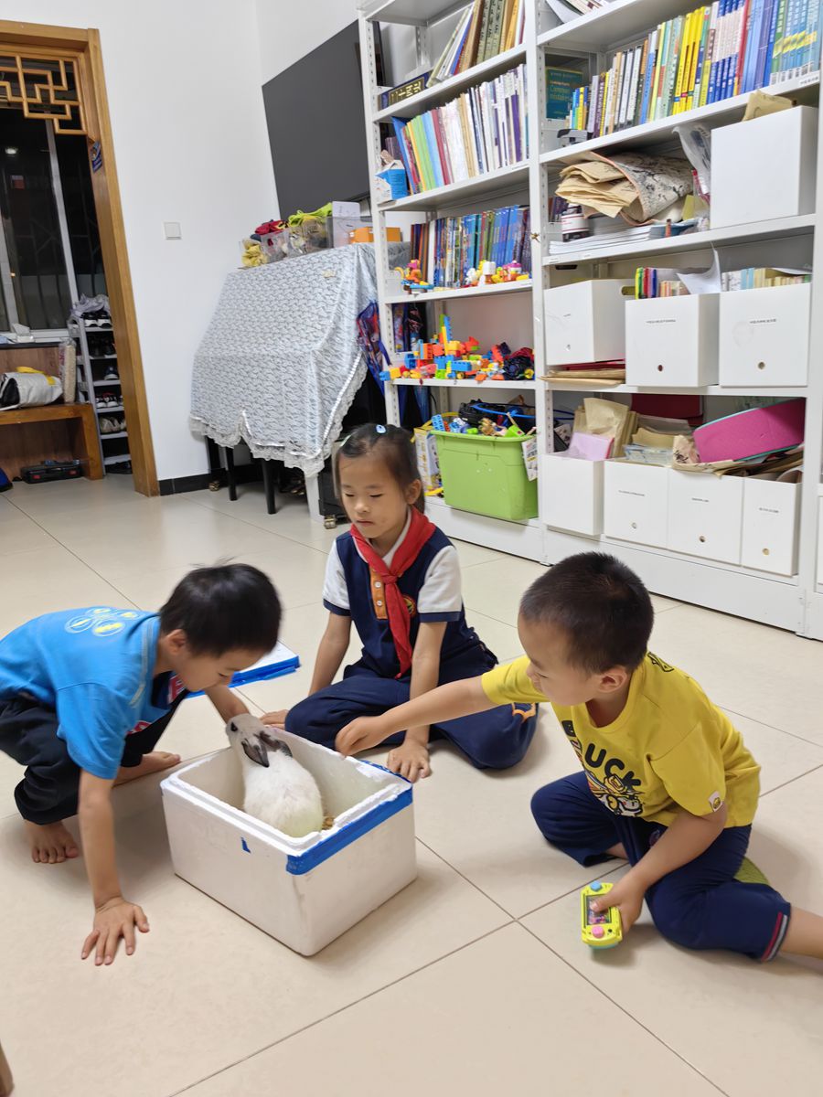 我們聊著大人的話題,孩子們有他們的天地世界。三個孩子一會逗玩可愛的小兔子,一會兒姐姐教弟弟寫字畫畫,小兒子則抱著媽媽的脖子撒嬌。
