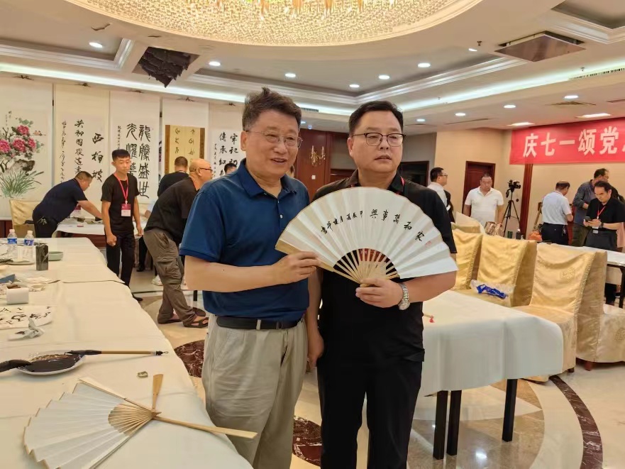 此次西柏坡之行,除了書畫展之外還有現(xiàn)場筆會。策劃老師和組委會做了精心準(zhǔn)備,購備了上乘的扇面、宣紙、墨汁、毛氈。拼成10多張大桌,幾十位書畫名家有備而來,欣然揮毫潑墨。