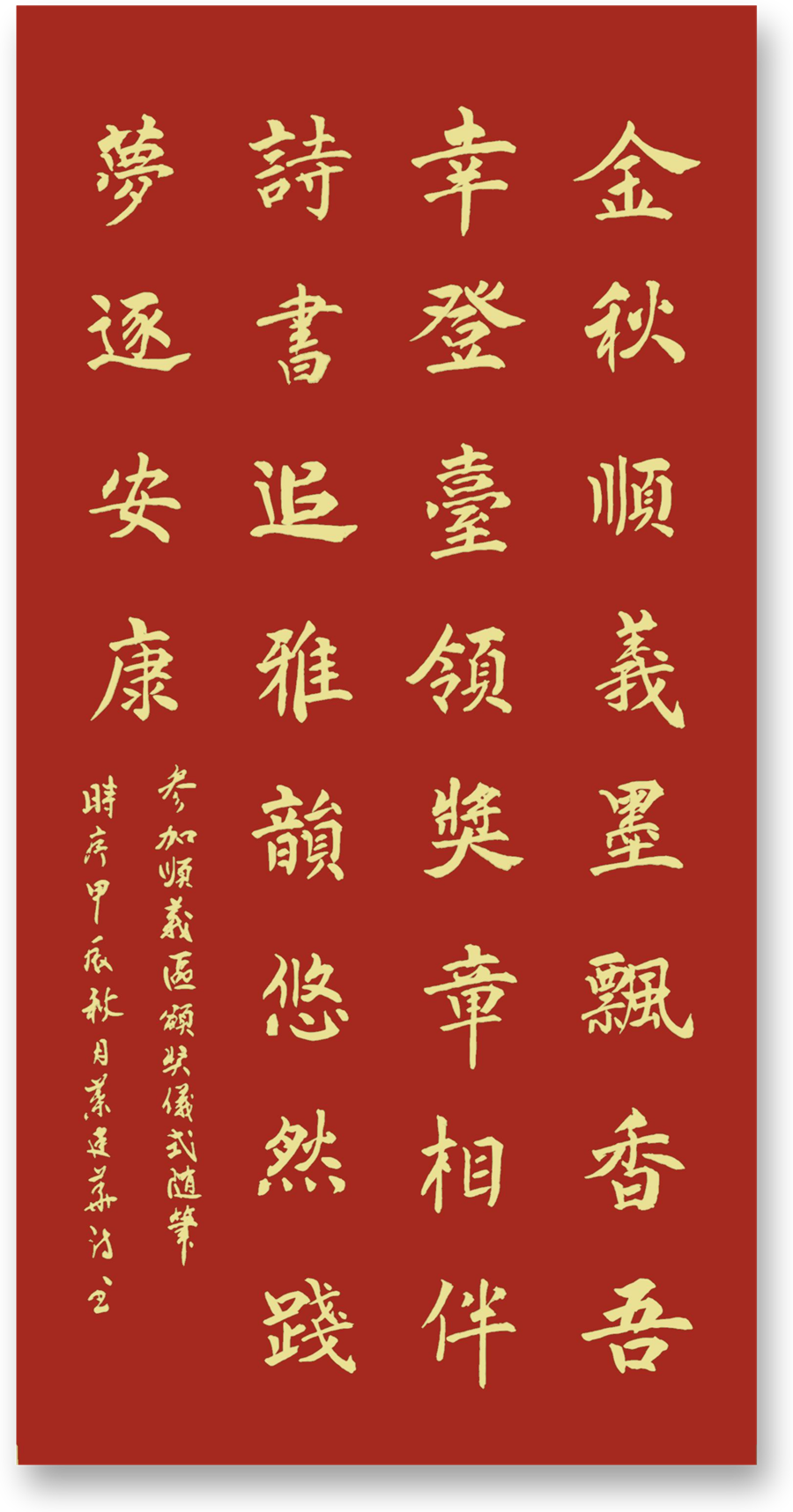 今年是新中國(guó)成立75周年喜慶之年,各地各部門(mén)都爭(zhēng)相舉辦慶祝活動(dòng)。我也應(yīng)邀參加了好幾個(gè)書(shū)畫(huà)展,其中一個(gè)是藍(lán)星花園居委會(huì)安排的書(shū)法作品參加順義區(qū)社會(huì)化管理退休人員書(shū)畫(huà)攝影大賽。我想到今年是龍年,便欣然潑墨揮毫在四尺宣紙上寫(xiě)了一幅行楷“龍騰”榜書(shū)參賽。至于主辦方告訴我要網(wǎng)絡(luò)投票,我則告訴他們,此次投稿,重在應(yīng)邀參與,就不麻煩朋友費(fèi)時(shí)費(fèi)心為我投票,因此,我連投票的網(wǎng)址也沒(méi)有關(guān)注。幾天前主辦方告訴我,我的作品獲得了三等獎(jiǎng),并于10月24日下午到順義區(qū)老干部活動(dòng)中心參加頒獎(jiǎng)儀式。