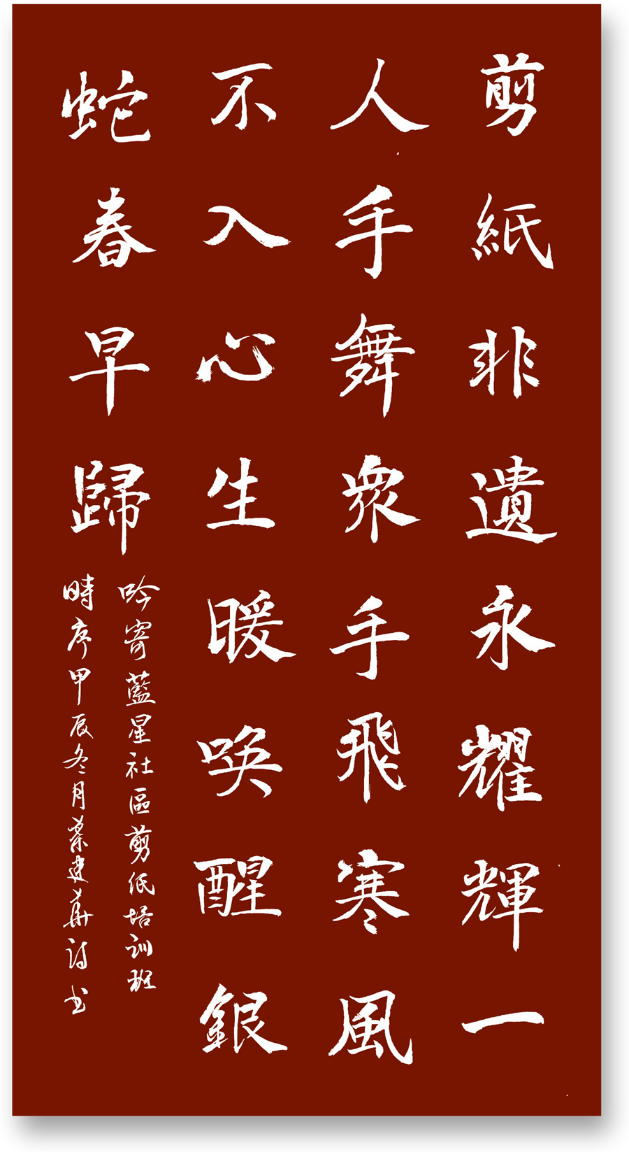 2025年1月7日,由藍(lán)星花園社區(qū)和浙商銀行聯(lián)合組織的非遺剪紙培訓(xùn)班在藍(lán)星花園社區(qū)文化活動室舉辦。10多位剪紙愛好者在剪紙非遺傳人郝蘭英老師的指導(dǎo)下翻飛剪刀剪出一條條靈動可愛的銀蛇,迎接乙巳新春的到來。