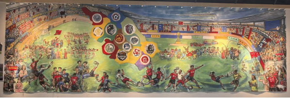 其二,是江蘇城市精神與文體精神的集中彰顯。畫作中 13 支球隊的隊標與江蘇省地圖呼應,展現(xiàn)了江蘇 “十三市聯(lián)動” 的文體格局;泰州 11 號的倒掛金鉤、鎮(zhèn)江 47 號的英勇?lián)跚颍坍嫷氖?“拼搏不服輸” 的文體精神;米盧觀賽、球迷助威的場景,則傳遞出江蘇對足球運動的熱愛與包容。這些元素共同勾勒出江蘇 “崇文尚武” 的城市氣質,讓畫作成為展現(xiàn)江蘇地域文化的 “視覺名片”。